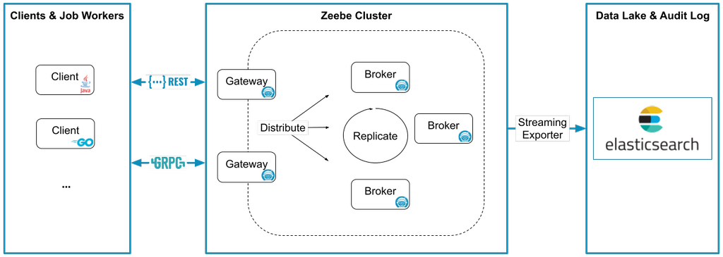 The core of the system is the Zeebe cluster. It is a workflow engine, so it stores the current process state, intermediate values, job timeouts, transitions between jobs, etc. Based on the official documentation it has great scalability options, so can handle dozens of processes, jobs, and states. I didn't test that and our system is not so big, we don't have trillions of processes/jobs, so I just leave this statement about performance as is.